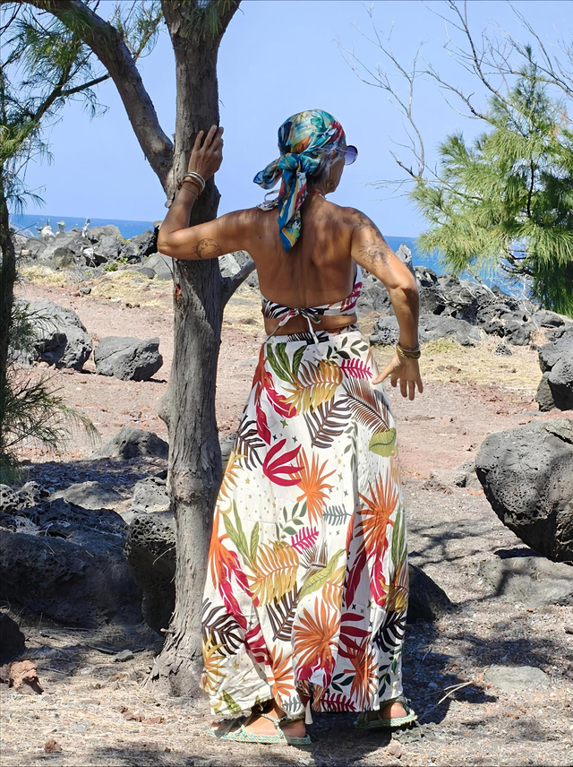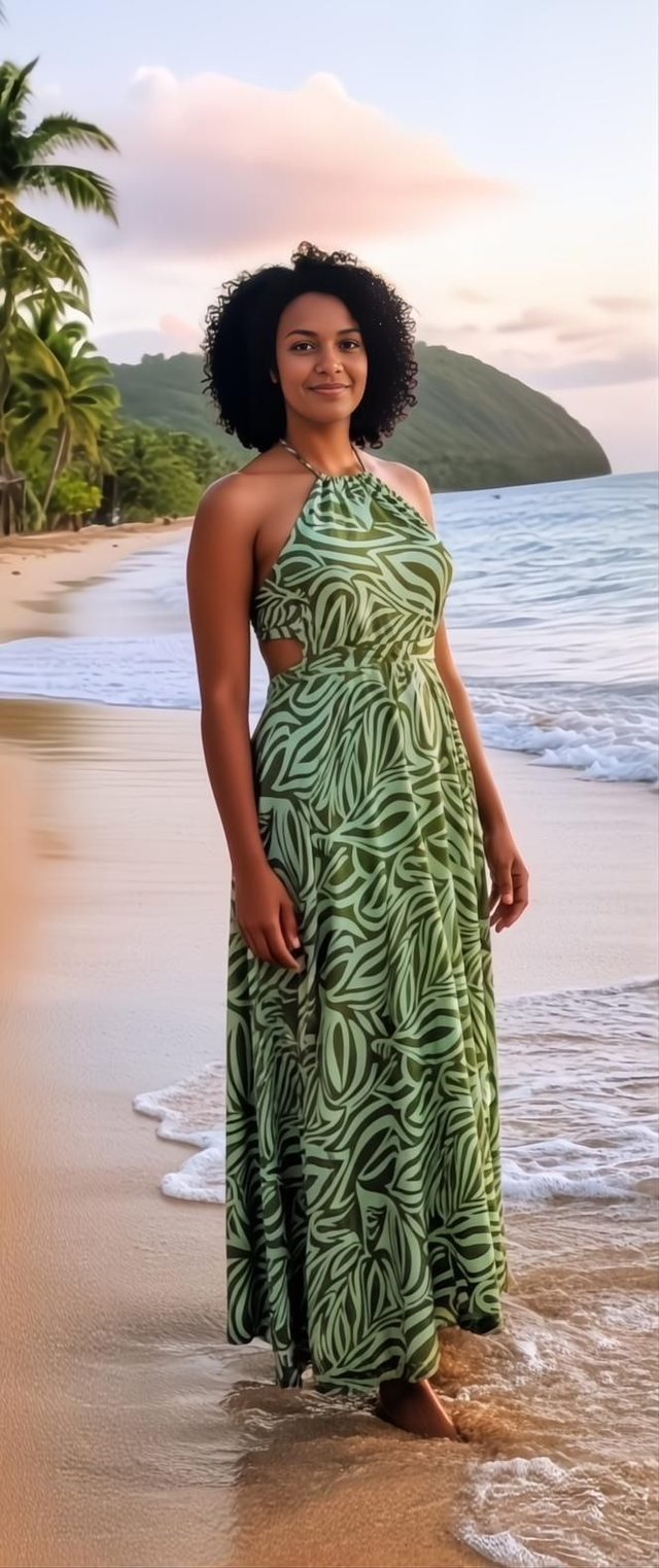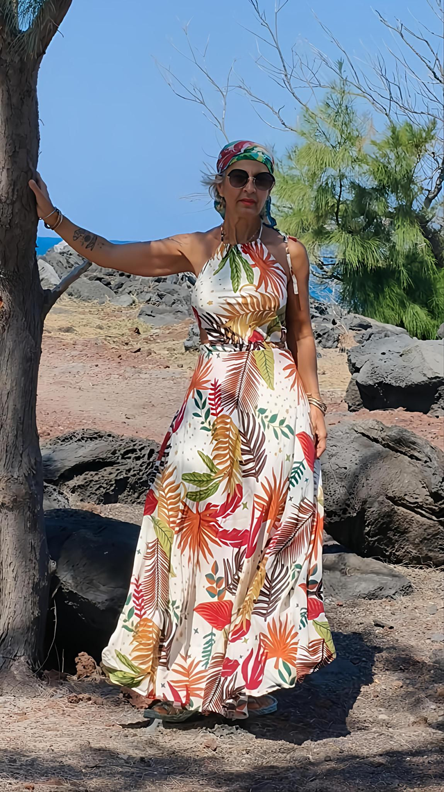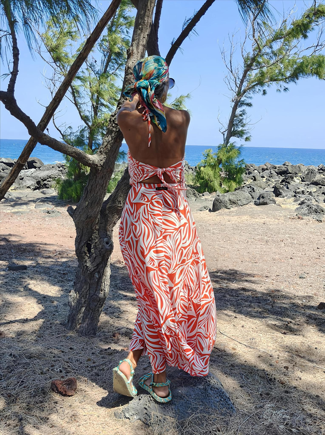 Cette magnifique robe longue et fluide se distingue par son motif vibrant. ORANGE, VERT ou Tropical. Un choix audacieux qui garantit un style incomparable.